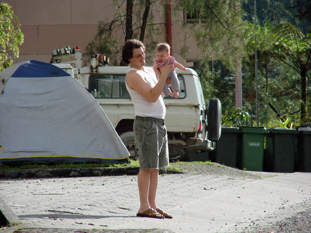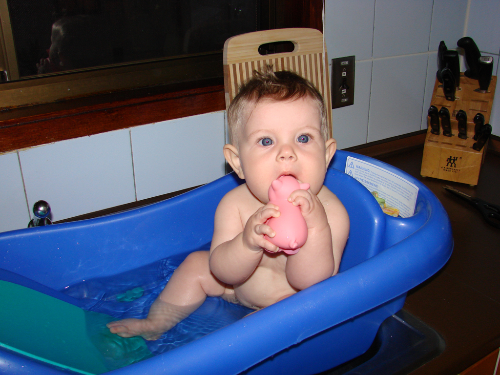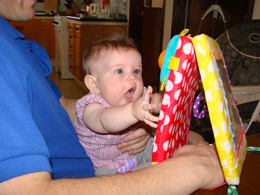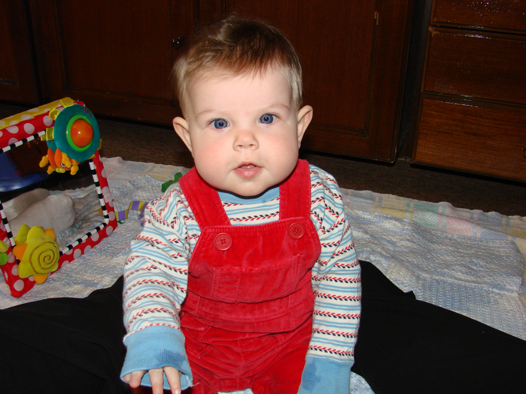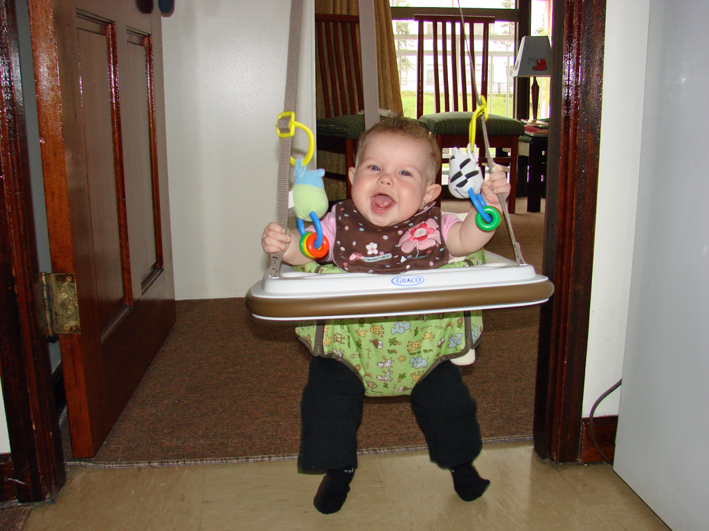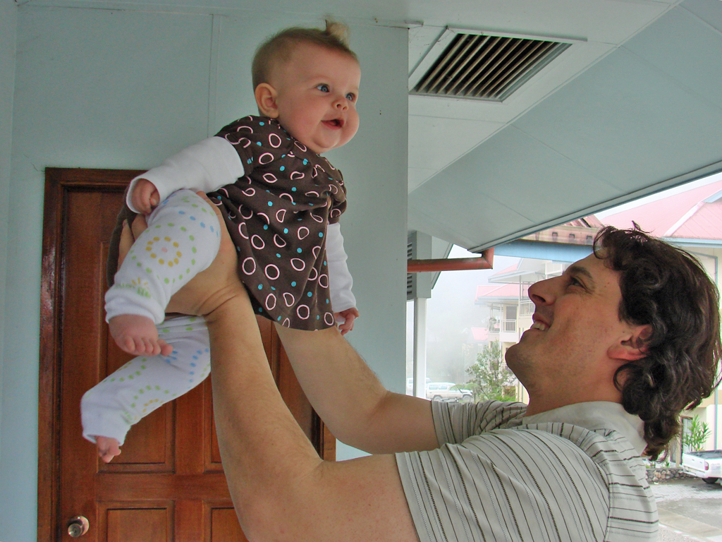 Diana had her 6 month immunizations this week and did pretty well. We have to go back again in two weeks for round two, but then not again for quite a while. She is on the petite size for her age (despite being so chubby), so she’s fitting into her 6 month clothes, but things labeled 6-9 months are a little bulky. Plus, we’re discovering that all of those “gender neutral” clothes do look a little masculine on her. That, coupled with the fact that all Indonesian girls have their ears pierced as babies, means that most folks we meet think she’s a boy (even if she’s wearing pink!). She doesn’t seem to mind though, and is happier in a pair of overalls than a dress anyway, so she’s already a little tomboy.
