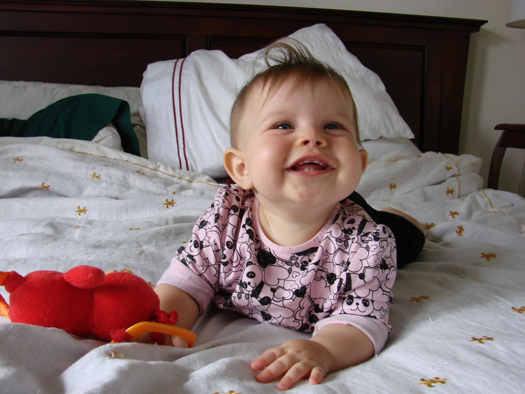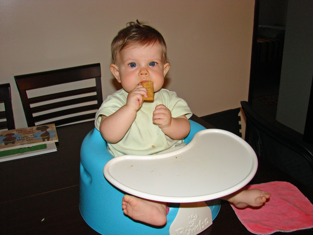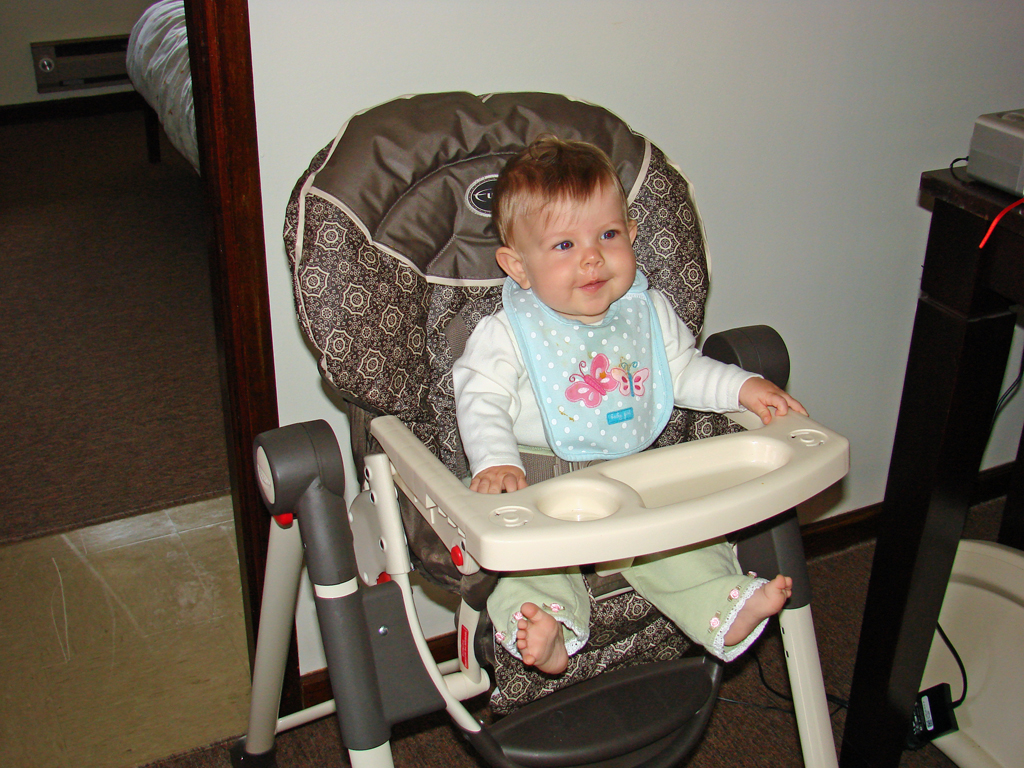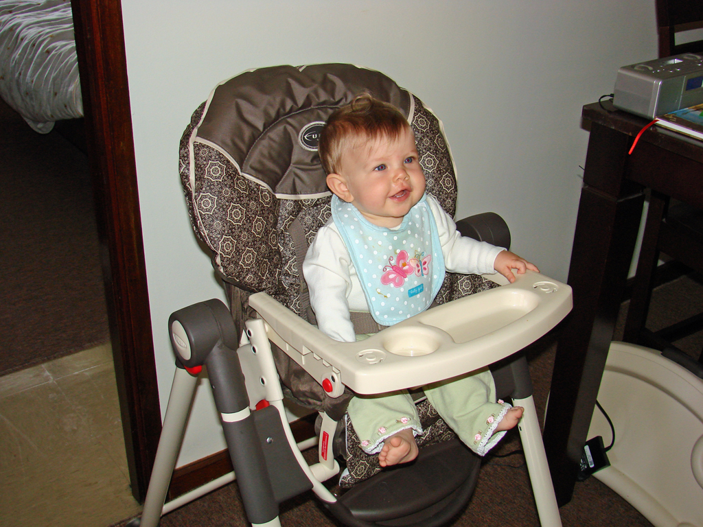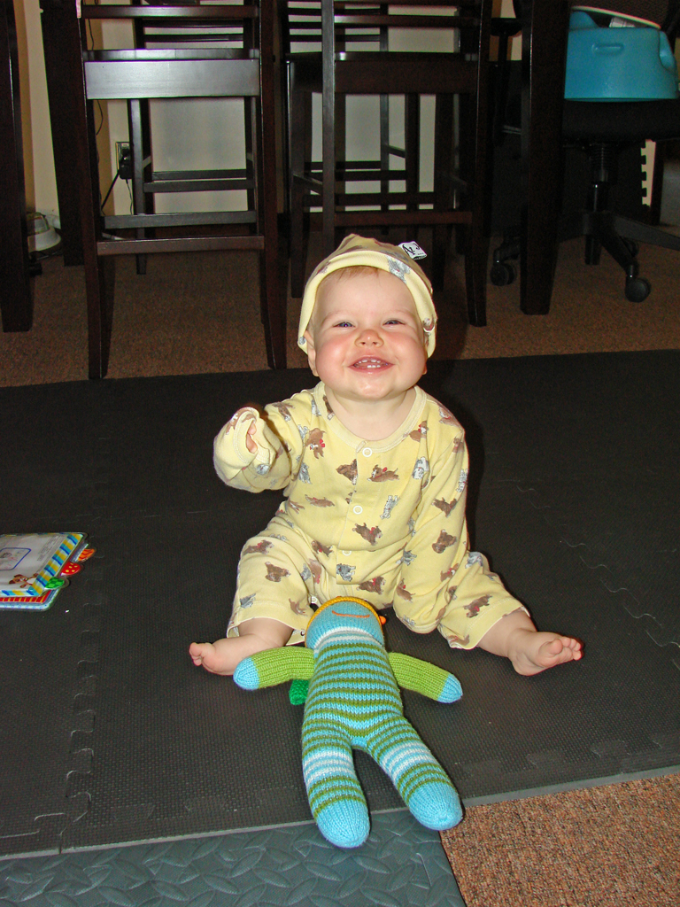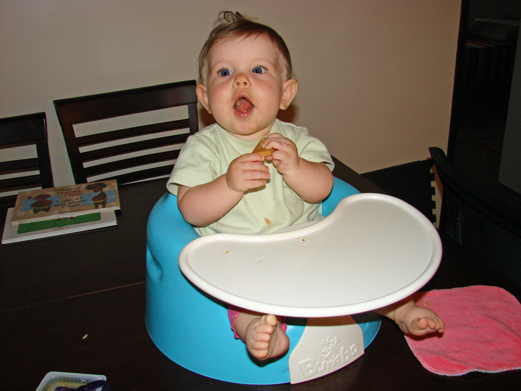 Diana has undergone a sea-change this week. She started eating twice as much food at every meal three days ago and shows no signs of letting up. Maybe she’s finally decided it’s time to grow a little! Her eighth tooth is coming in on the bottom, so she’s drooling a lot more again, but she’s staying hydrated with her improved use of her sippy-cup. We’re both very proud of her, although Emily is most proud of her recent improvements in sleep habits! She has been truly sleeping “through the night” from her 6:30 bedtime until 6:30 or 7am without feeding, and even without waking and fussing in the night. Em still doesn’t know quite what to do with herself since she’s still waking up instinctively at 1 or 2 in the morning, but hopefully that will go away soon.
