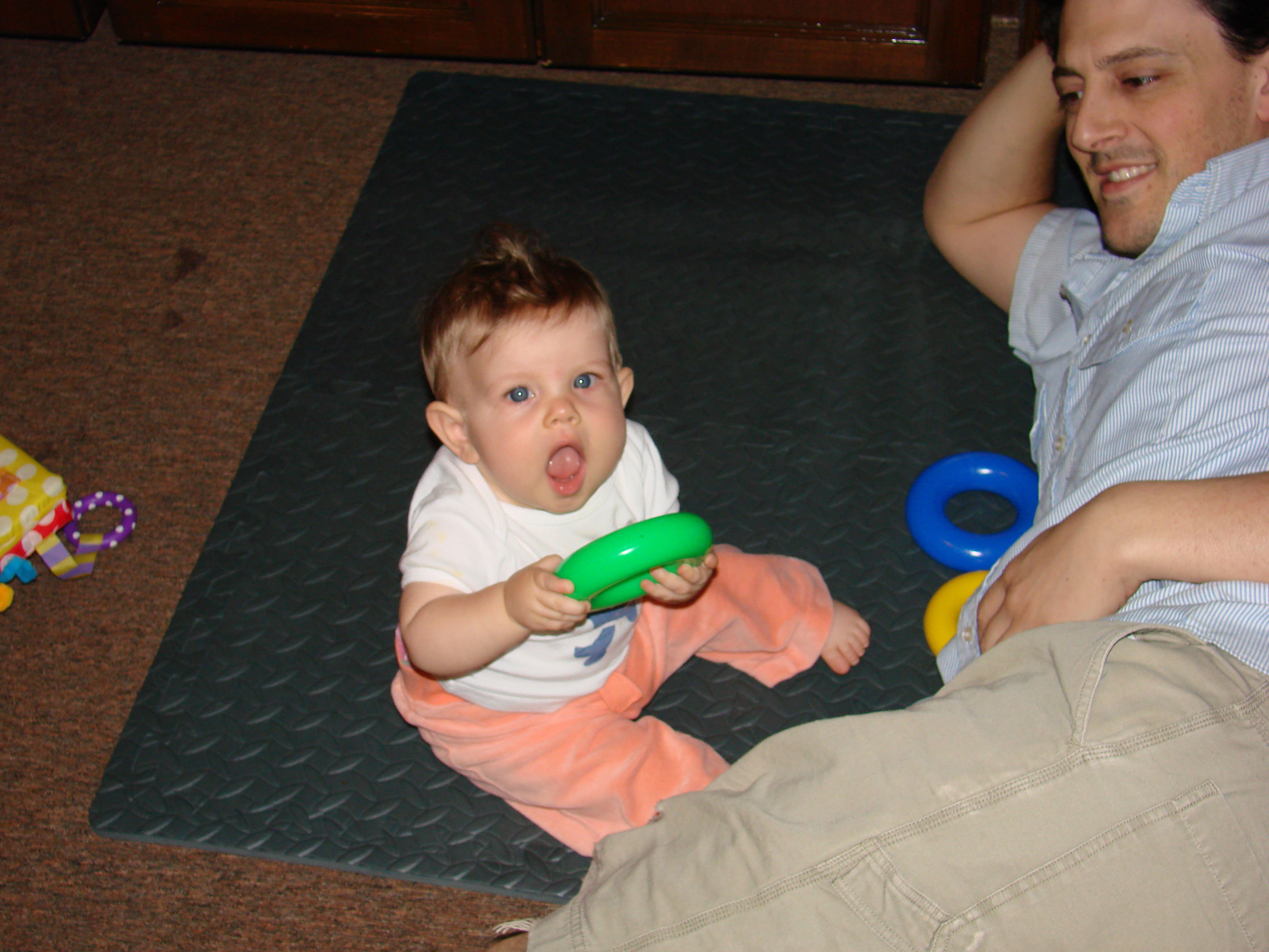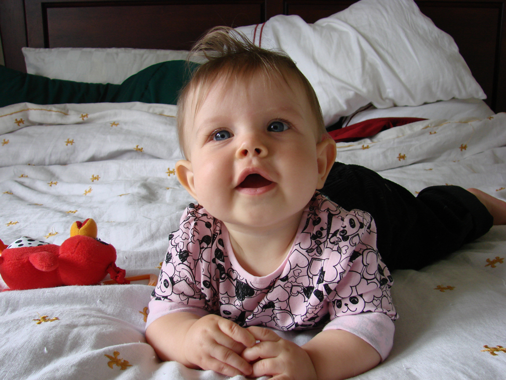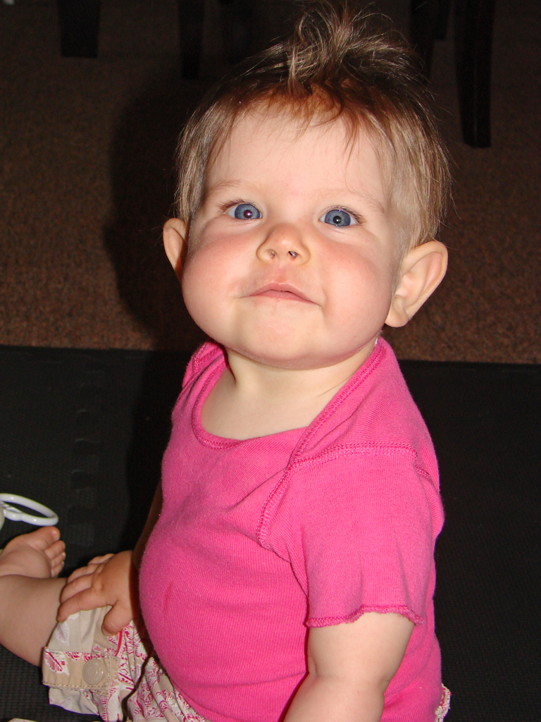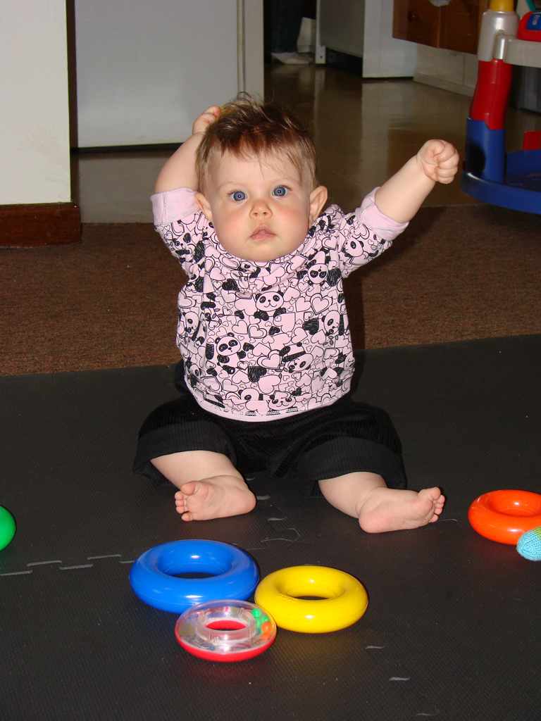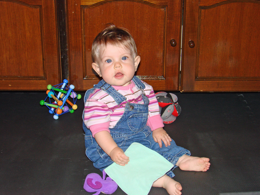 Diana has undergone a sea-change this week. She started eating twice as much food at every meal three days ago and shows no signs of letting up. Maybe she’s finally decided it’s time to grow a little! Her eighth tooth is coming in on the bottom, so she’s drooling a lot more again, but she’s staying hydrated with her improved use of her sippy-cup. We’re both very proud of her, although Emily is most proud of her recent improvements in sleep habits! She has been truly sleeping “through the night” from her 6:30 bedtime until 6:30 or 7am without feeding, and even without waking and fussing in the night. Em still doesn’t know quite what to do with herself since she’s still waking up instinctively at 1 or 2 in the morning, but hopefully that will go away soon.