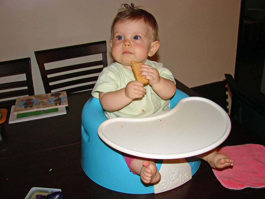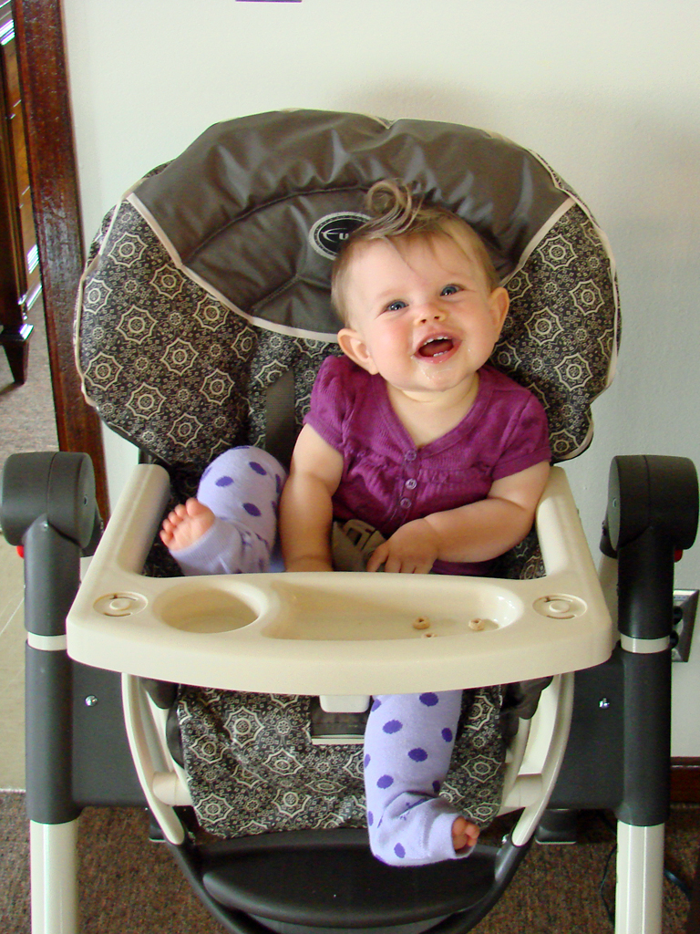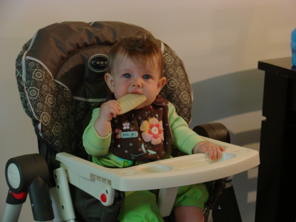 Since she’s eating so much more, we’ve been able to get her interested in rice cereal and more vegetables. She really liked holding and looking at broccoli, but she’s not quite sure what to do with it yet. It did make it in her mouth, but she mostly just enjoyed squeezing it until it broke apart. The spiral pasta and whole-wheat toast fared a little better, but they both also got squeezed a lot before they got eaten.