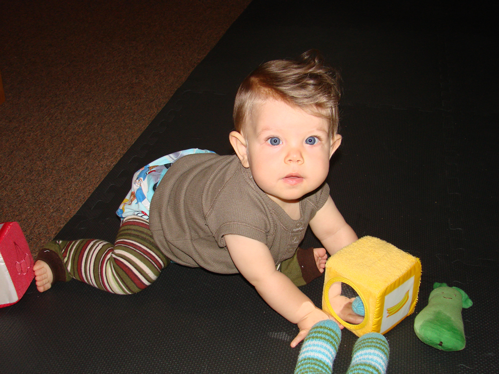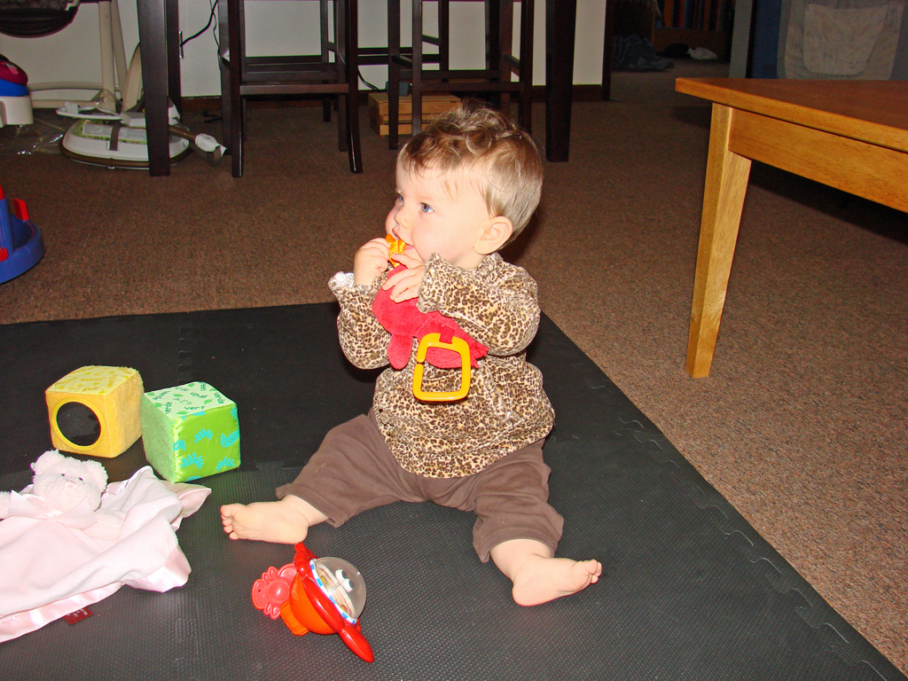 Now that Diana has passed the 9 month mark and is fully recovered from her roseola, we’ve been keeping her pretty active. We’re still going to language classes twice a week, and are working on getting Diana to take two naps a day instead of three so we can do more during the day. So far it’s working well, and the two slightly longer naps actually seem to make her happier and better rested in the evenings. She’s also got her appetite back, which means we’re trying some new foods and working on finding a new vegetable that she’ll tolerate. She’s loving cheese and yoghurt still, but her new favorite food is whole wheat toast with a smear of pureed fruit (or squash or sweet potato) on top.