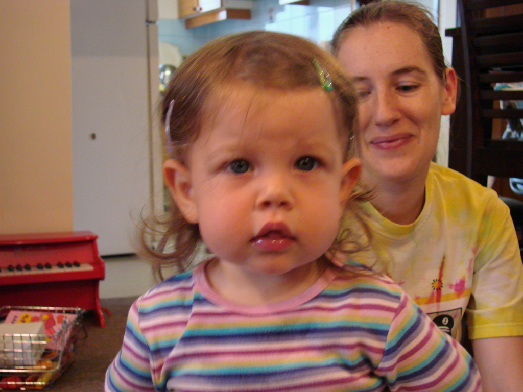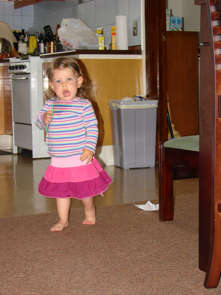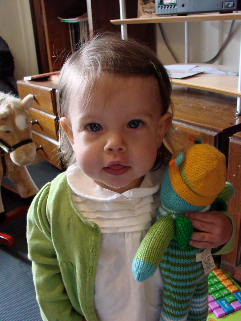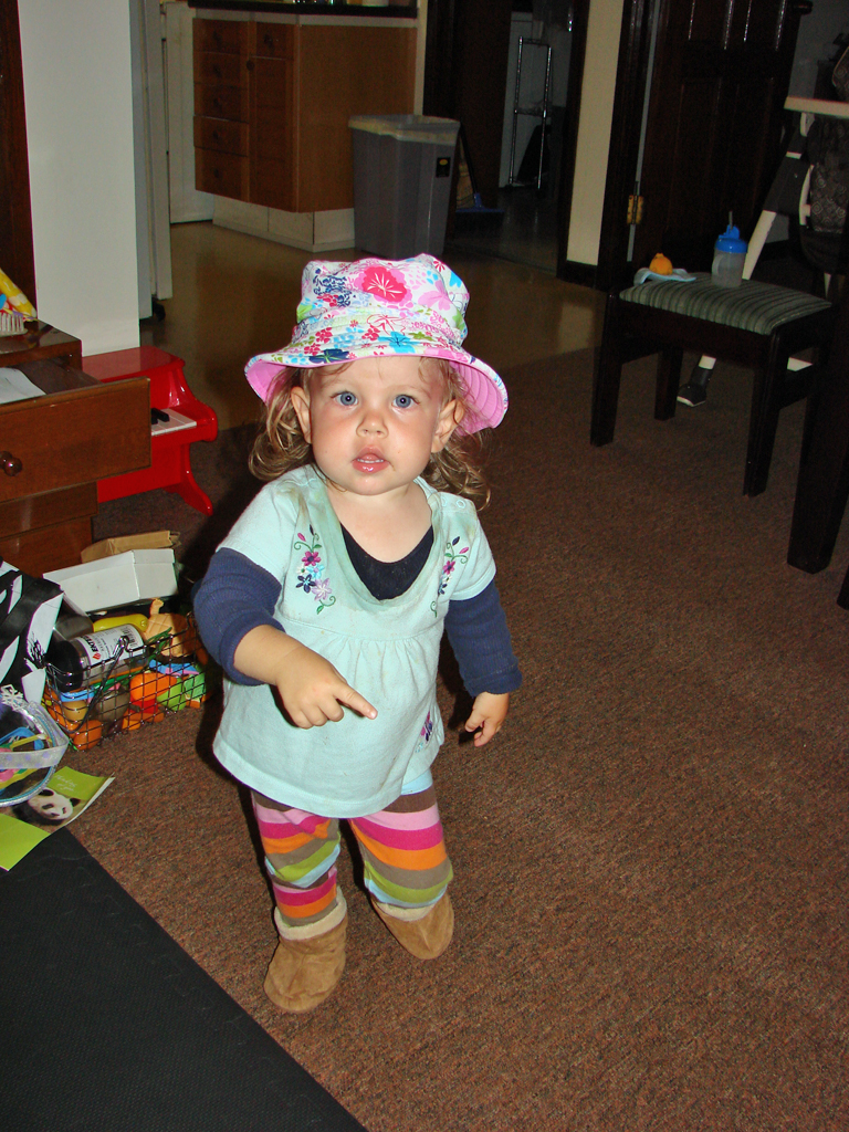 Diana has been so active lately that we haven’t gotten many new pictures, so we’ve included a few oldies but goodies for this post, including one from a year ago so you can see how much she’s grown. Well, maybe she hasn’t grown that much… She’s still super tiny for her age, and has been hovering around 20 lbs. (5th percentile-ish) for the past few months. But she’s talking and eating a lot, so we’re trying not to worry about her little size. We all had a wonderful time at a Cinco de Mayo dinner at the club, and Diana particularly liked the beef tenderloin and corn chips. She’s also started to enjoy peanut butter and jelly sandwiches and carrot sticks. While she’s still using mostly single words, she does have a few phrases that she uses (e.g. “hold it,” “thank you”), and is starting to experiment more with putting multiple words together. She’s also speaking a lot of Bahasa Indonesia, thanks to our nanny and the Indonesian kids that she plays with at the park. She doesn’t say as many phrases in Indonesian, but she actually knows her numbers better than in English.