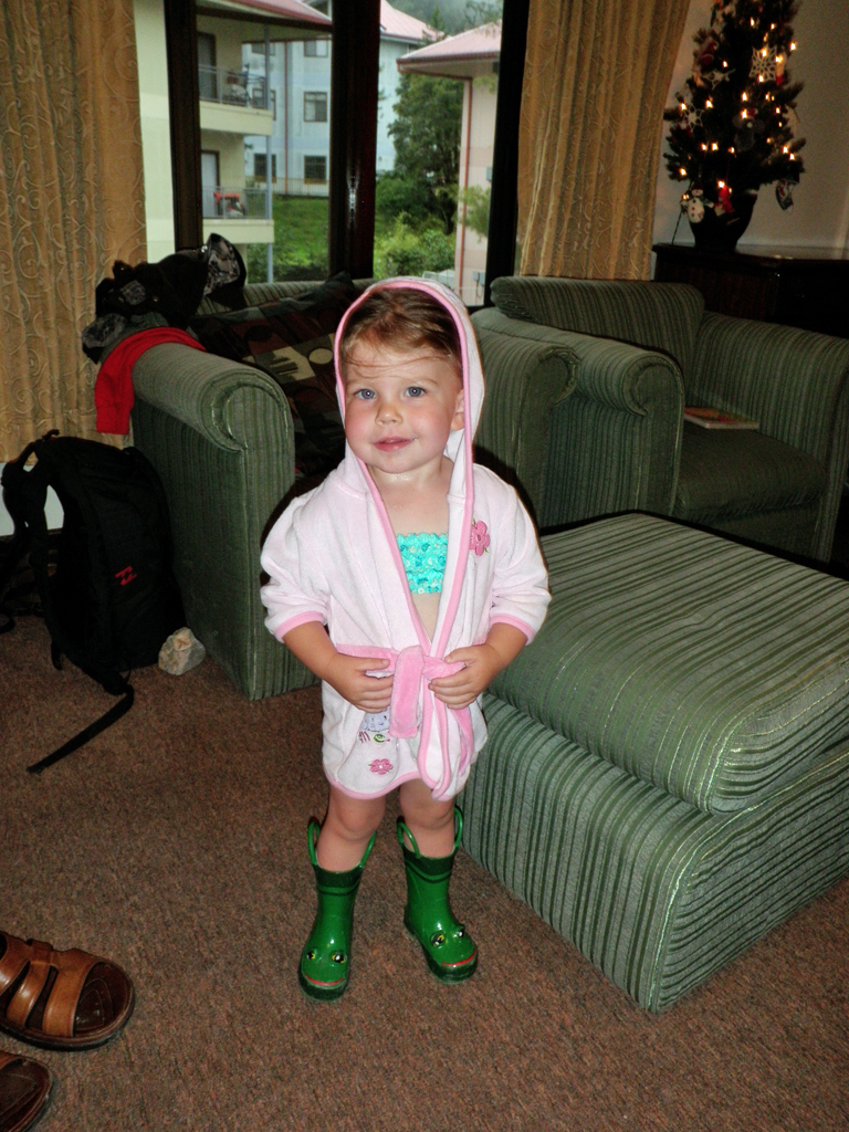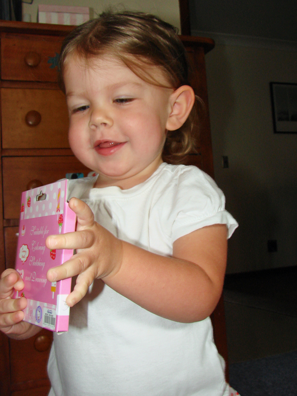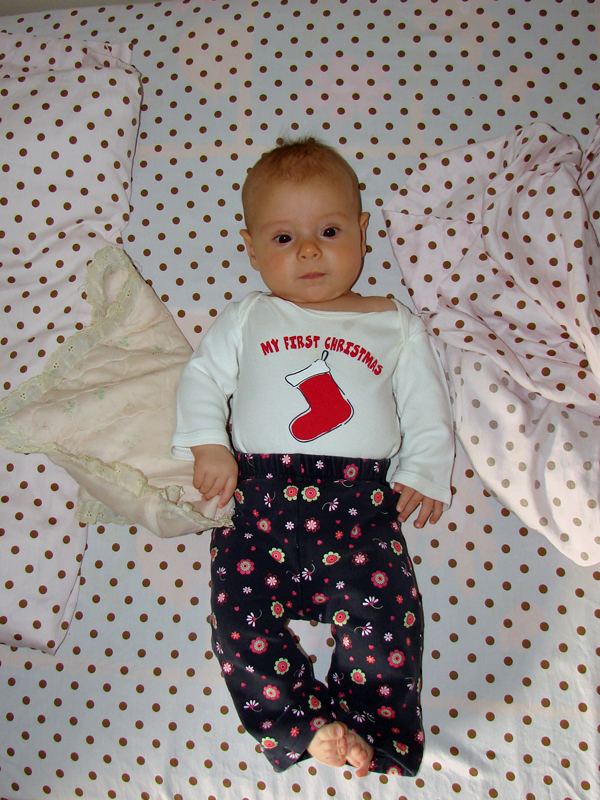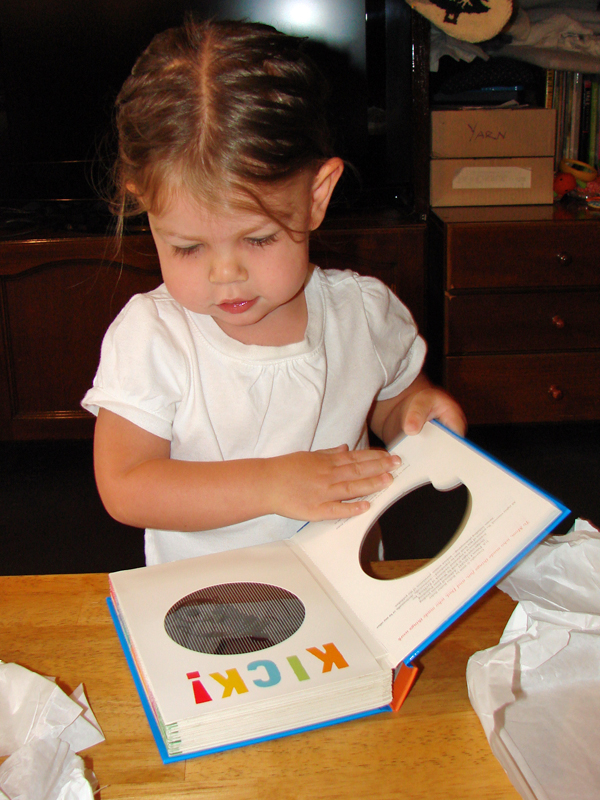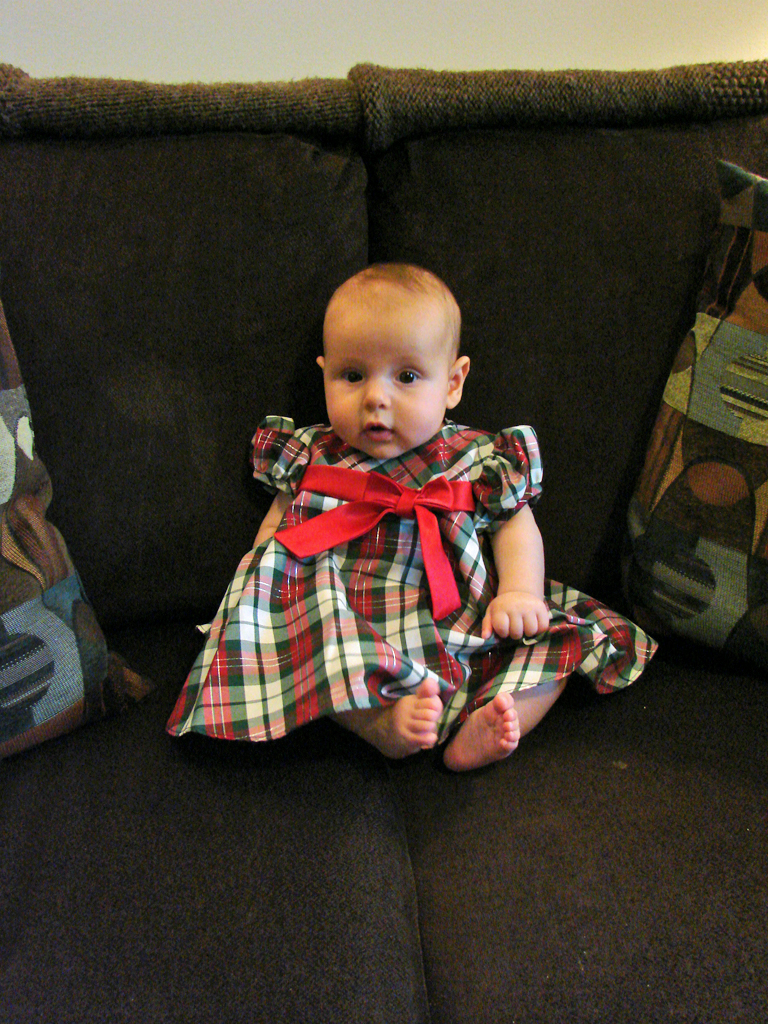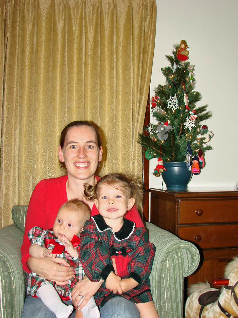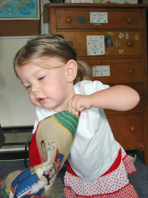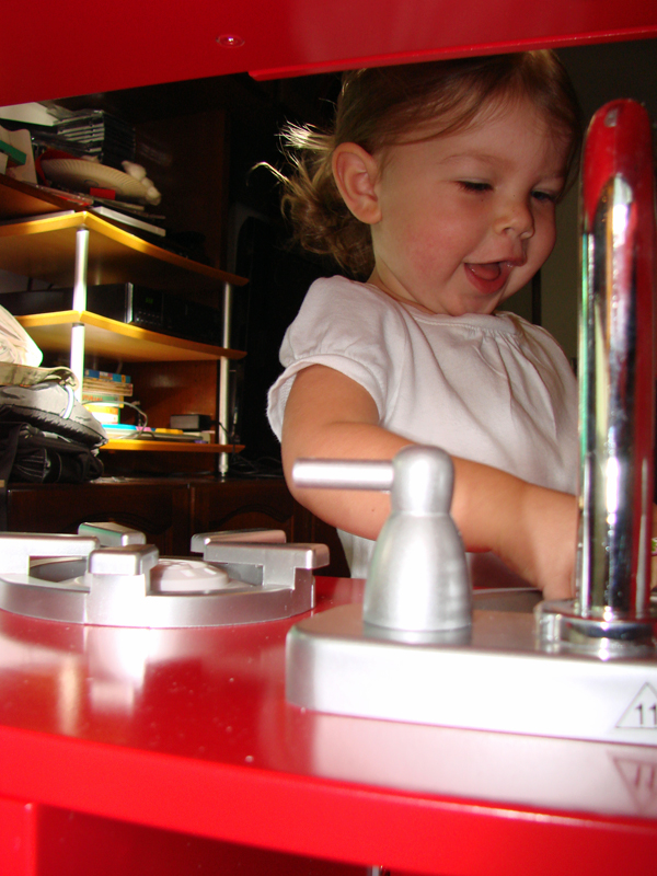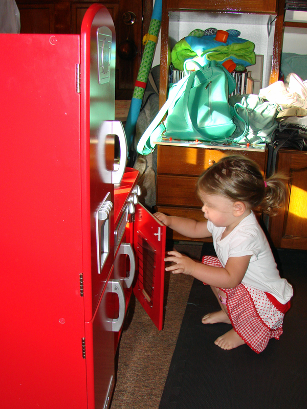 We went to a neighborhood Christmas Eve party and got the girls all dressed up. Both girls had a good time, and we were happy to have left before Santa arrived (a few of the other 3 and unders were a little cranky by that point). Diana seemed to understand the concept of Santa, in that he would come and bring chocolate and presents. On Christmas morning, it took her a while to even see her stocking (which “Santa” left hung up on her dresser). Once she saw it, she loved taking out all of the things and looking at each one throughly. She got some crayons, and took them out to draw, and then saw that Santa had left an even bigger present – her new red kitchen set. She has been playing with it non-stop since then. We, er, I mean Santa, was clever enough to hide the rest of her and Helen’s presents inside the various doors, so she had a lot of fun finding everything. Hope you all enjoy the photos!